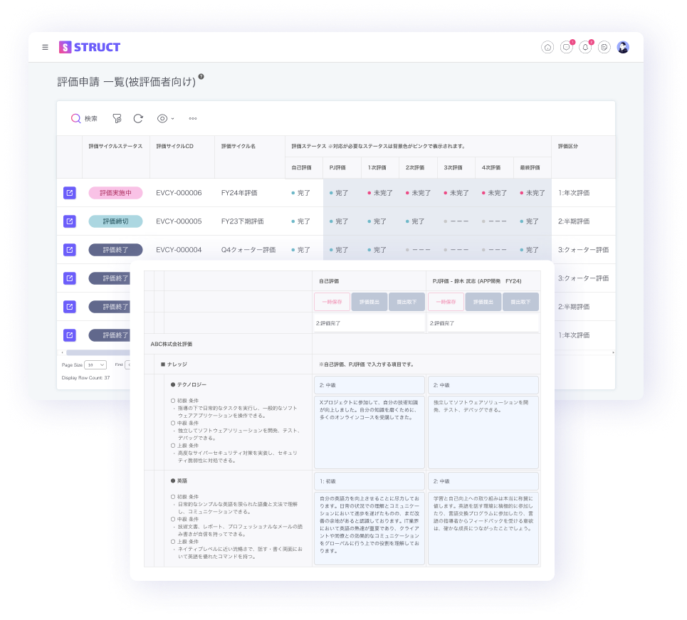 STRUCTでは、各評価プロセスのステイタスが完了・未完了で表示されるため、対象スタッフの評価漏れを防ぐことができます。