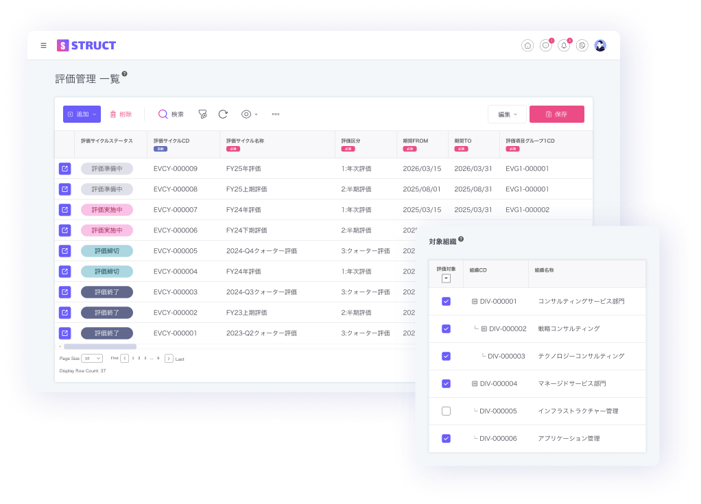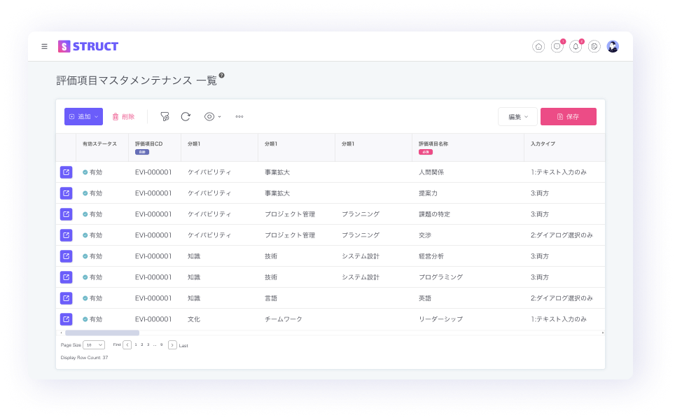 STRUCTでは、下記の評価マスタが設定されており、企業の現状に合わせたフレキシブルな人事評価の設計が実現できます。