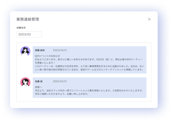 業務連絡管理機能と組み合わせることで、漏れなく社内に周知することができ、活用の幅が広がります。