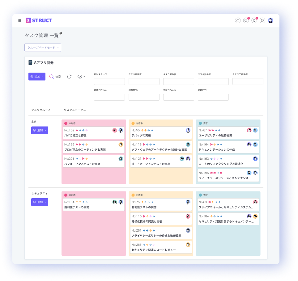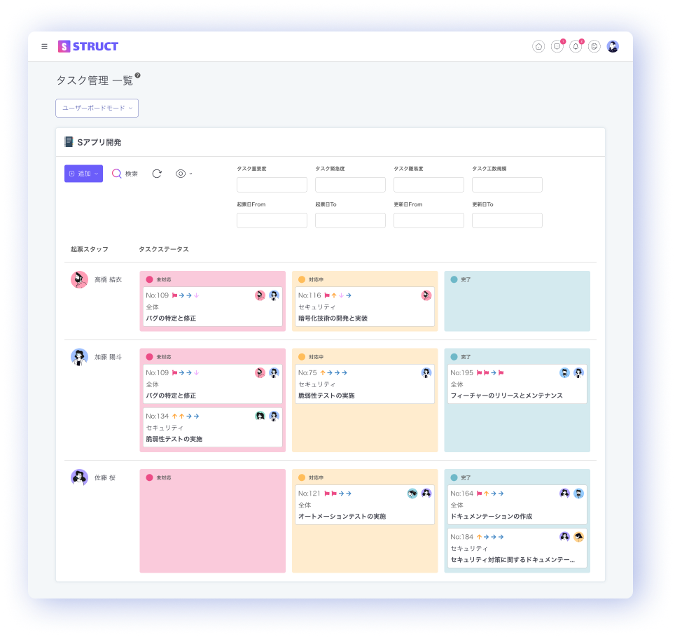 各カテゴリーにおけるステータスごとのタスクが一覧で表示されるため、タスク対応の優先順位付けなどが容易になります。